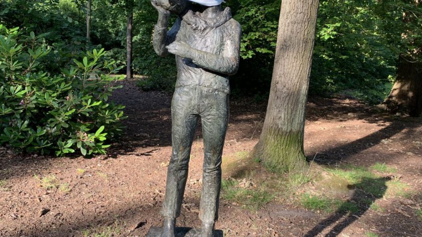 Ook kunstliefhebbers maken zich zorgen in deze tijd van pandemie. Zullen de beelden in Leidschendam-Voorburg het corona virus overleven? Houden passanten wel netjes anderhalve meter afstand? Omdat men nooit voorzichtig genoeg kan zijn, heeft een fanaat dit beeld in park Vreugd en Rust van een mondkapje voorzien. Eerder al toonde ook Museum Swaensteyn beelden met gezichtsbescherming. (foto Niven Press)