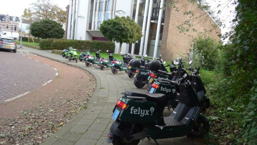 Het lijkt wel een parkeerplaats. Een vol elektrische scooters, maar dan wel op de stoep. Wie op de Fonteynenburglaan in Voorburg wandelt, moet de straat op om verder te kunnen. Een verhuurbedrijf heeft hier het afhaalpunt voor huurscooters ingericht. Of dat met toestemming van de gemeente is gebeurd, is onbekend. Zeker is dat het parkeerterrein op deze wijze voor de nodige ergernis zorgt. (foto Ap de Heus)