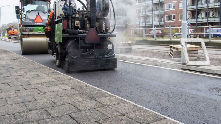 Na maanden van werkzaamheden is de herinrichting van de Mgr. Van Steelaan tussen de Spinozalaan en de Prinses Irenelaan in Voorburg bijna klaar. Als alles goed gaat kan het verkeer dit weekeinde weer in beide richtingen doorrijden. Op de foto wordt het asfalt op de fietspaden aangebracht. (foto HK)