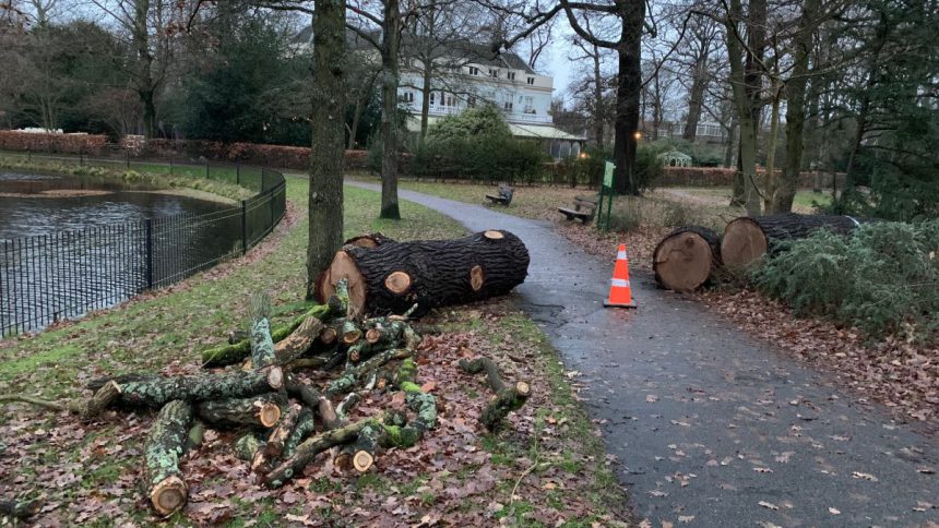 Het is alweer een paar weken geleden dat er in Park Vreugd en Rust een enorme boom werd omgezaagd. Te ziek om te redden, aldus de uitleg. Prima. Maar menig wandelaar in dit Voorburgse park vraagt zich af, waarom er weken later nog niets is opgeruimd. Delen van de stronk liggen her en der verspreid. Bovendien is het wandelpad beschadigd. Hiervoor staat er al die tijd al een pion op het pad. Maar verder gebeurt er niks. (foto Niven Press)