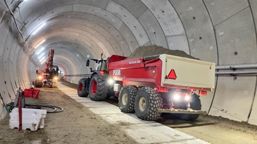 Na de kerstvakantie is het werk in de Corbulotunnel voor de toekomstige RijnlandRoute meteen hervat. In de eerste tunnelbuis is Comol5 alweer een week volop bezig met het inrijden van aanvulmateriaal, dat aan weerszijden van de kabelkokers wordt aangebracht. Later komt hier het asfalt overheen. Omdat de tractor met kiepwagen niet kan keren in de tunnel, moeten ze het hele stuk achteruit rijden. Vorig jaar werden de vrieslansen onder het wegdekniveau al geboord en aangebracht. Nu start men  met het aanbrengen van de vrieslansen boven het wegdekniveau. Niet lang daarna wordt de vriesinstallatie opgestart en begint het bevriezen van de ondergrond om de dwarsverbindingen uit te kunnen graven. (foto RijnlandRoute)