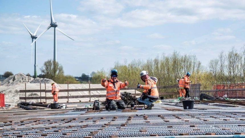 Het civiele werk voor de fly-overs van het nieuwe knooppunt Hofvliet, dat de snelweg A4 met de geboorde tunnel en verdiepte ligging voor de N434 (RijnlandRoute) verbindt, nadert de afronding. Op dit moment worden de voorbereidingen getroffen voor de stort van het laatste dek. Daarna volgt alleen nog de afwerking. Het beton voor de vloer is inmiddels gestort, waar bovenop de sparingsbuizen komen, waardoor er een minder zware constructie ontstaat. Hierna brengt men de wapening voor het dek aan en wordt het beton gestort. Het vlechten van de stalen wapening is monnikenwerk. Alle ijzeren vlechtdraadjes die door de wapening heen zijn gevallen moeten met de hand worden verwijderd, om roestvorming aan de onderzijde van het dek te voorkomen. (Foto: Fred Leeflang)