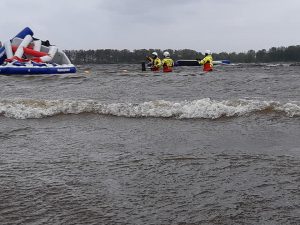 Er werd besloten om de alarmploeg in te zetten om bij deze situatie te ondersteunen. Binnen 45 minuten na de eerste melding waren de eerste twee boten ter plaatse. Vanwege de veiligheid is er gekozen wadend vanaf het strand te werk te gaan. De grote luchtkussens konden door de sterke wind makkelijk opgetild worden. Het was dus van belang dat deze goed gezekerd en gecontroleerd naar het strand werden begeleid. Gedurende de avond zijn er meerdere objecten veilig naar de kant begeleid. Omstreeks 23:00 was de inzet klaar, het materiaal opgeruimd en was de klus geëvalueerd. (foto’s Reddingsbrigade)