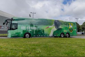 Dit is hem dan: de vers bestickerde bus van Van Heugten Tours voor de spelers van ADO Den Haag. Het bedrijf van John van Zweden tekende voor dit fraaie stukje werk. Vooral de enorme ooievaar zal indruk op de te bezoeken partij maken! De presentatie van de touringcar was gisteren een van de vele activiteiten, tijdens de druk bezochte spelerspresentatie. De verkoop van de nieuwe tenues loopt boven verwachting. Daarom zal de Fanstore in het Cars Jeans Stadion vandaag, zondag, van 12.00 tot 17.00 uur haar deuren openen voor iedereen die zaterdag niet langs kon komen! (foto’s ADO Den Haag)