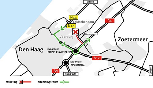 Het verkeer dat dit weekeinde Leidschendam-Voorburg via de N14 richting A4 wil verlaten, moet omrijden. Rijkswaterstaat voert namelijk sinds gisteravond tot zondagochtend 10 oktober 10:00 uur een noodreparatie uit aan leidingen onder de weg op de N14 (het Sytwende tracé). Daarom is deze tussen de kruising met de Bezuidenhoutseweg en de A4 afgesloten. Het verkeer wordt omgeleid via de N44, A12 en A4. Vooral rond de Mall dreigt enorme verkeersdrukte.