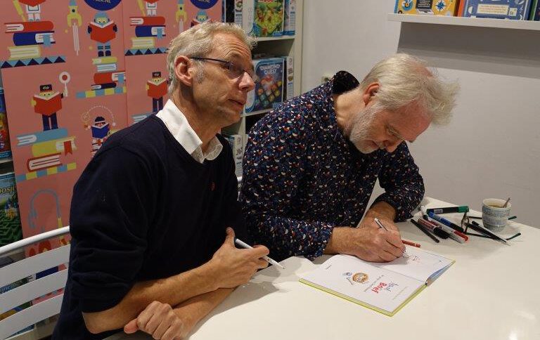 Nu de coronamaatregelen wat soepeler zijn, kan er ook weer gesigneerd worden. En dat gebeurde dit weekend in het kader van de Kinderboekenweek bij In de Wolken. Na het voorlezen van  ‘Agent en Boef’ bij de kinderboekenwinkel in de Voorburgse Herenstraat stonden schrijver Tjibbe Veldkamp en illustrator Kees de Boer paraat om de boeken met hun krabbels op te luisteren.