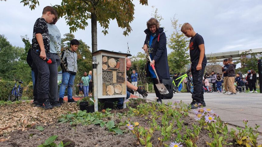 Stadsbeheer is wel wat gewend want naast het gewone werk leiden ze ook mensen op. Veel stagiaires zijn welkom op hun Erkend Leerbedrijf. Maar leerlingen van de basisschool dat is net even anders. Dus bleek dit avontuur niet alleen spannend voor de kinderen maar ook voor de medewerkers van Stadsbeheer. Gelukkig was er een goede samenwerking met Huygens Lab, Corbulo College en Basisschool de Driemaster. Het resultaat mag er zijn. Een B&B voor insecten die net als de kinderen het speelplein regelmatig bezoeken. (foto Stadsbeheer)