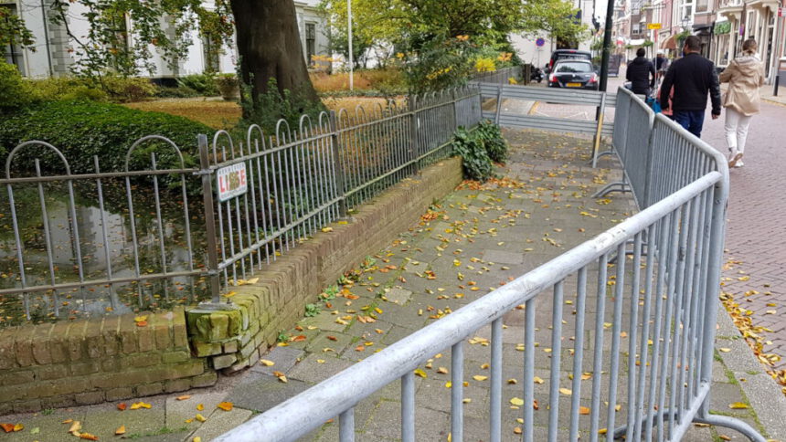 In allerijl is dezer dagen een hek neergezet op het trottoir bij de kruising Oosteinde-Rozenboomlaan in Voorburg. Daar dreigt een oude muur met dito hekwerk in te storten. Wie hier naar beneden buitelt, komt terecht in een vieze zijtak van de Vliet. Niet doen dus. Stadsbeheer was er in ieder geval op tijd bij om rampen te voorkomen. Nu maar afwachten hoe lang het duurt voor een en ander gerepareerd wordt. Elders in de gemeente, op het Koningin Julianaplein is net begonnen met de reparatie van een muurtje voor de sportwinkel. Dat was pas negen maanden geleden omver gereden…