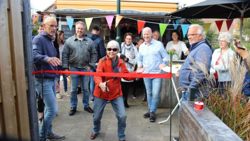 Bewoners hebben samen een gangpad van 60 meter aangelegd bij de Willem Klooslaan in Voorburg. Zo kunnen ze van meerdere kanten de achterzijde van hun woning bereiken. De bewoonster die er het langste woont, heeft het lint doorgeknipt. Omdat het pad niet van de gemeente is hebben alle omwonenden meebetaald. Ze lieten zich de drankjes en hapjes bij de feestelijke opening dan ook goed smaken. (foto Ap de Heus)