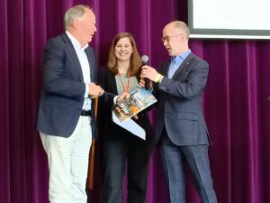 Het Veurs heeft samen met de oud-leerlingen vereniging van de school, de SOLVC, een prachtig jubileummagazine uitgegeven. Het eerste exemplaar werd door rector Philip de Vries overhandigd aan Paul van Meenen, Kamerlid voor D66. Paul was in het verleden jarenlang rector van het Veurs en daarna bestuurder van Scholengroep Spinoza. Ook PvdA raadslid Wil van Nunen, oud-docente van het Veurs, was aanwezig om mooie verhalen op te halen. Alle gasten konden een versie van het jubileummagazine in ontvangst nemen.