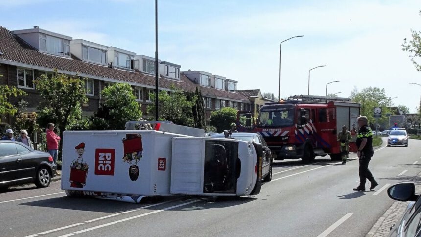 Op de Veursestraatweg in Leidschendam, vlak bij de ingang van Schakenbosch, deed zich gistermiddag rond half vier een bizar ongeluk voor. Een auto van bezorgdienst PicNic werd in de flank geraakt door een personenauto, toen de bestuurder vanuit parkeerstand wilde keren. De klap betekende dat de auto van PicNic om viel en op zijn zijkant op de weg terecht kwam. De onfortuinlijke bestuurder klom zelf uit zijn wagen. Behalve wat letsel aan zijn arm bleef hij ongedeerd. De twee inzittenden van de personenwagen werden wel afgevoerd naar het ziekenhuis. PicNic-collega’s hebben de boodschappen uit de aangereden wagen later alsnog bezorgd. Het voertuig zelf werd rechtgezet en ter reparatie afgevoerd. (foto’s Ressiva)