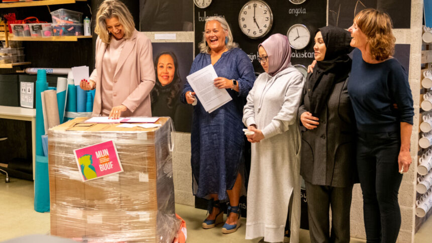 In het atelier van Mijn Buuf hebben de oprichters van Mijn Buuf, Petra Prent en Nicole van Vonderen, het eerste exemplaar van het boek ‘Mijn Buuf, hoe een kleine sociale onderneming grote impact maakt’ gegeven aan Jacqueline Prins, secretaris van de Sociaal Economische Raad, voorheen directeur Emancipatie bij het ministerie van Onderwijs.