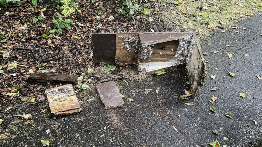 Door de hitte vallen niet alleen de vogels van het dak, maar ook hun huisjes uit de bomen. Dit tafereel trof fotograaf Nick van der Ven maandag aan op het pad achter het prieel  in de buurt van de kinderboerderij Vreugd en Rust. Zijn conclusie: ‘Was helemaal verrot’. (foto Niven Press)