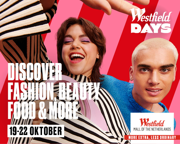 Westfield Mall of The Netherlands combineert het beste op het gebied van lifestyle, fashion, food, entertainment en beauty op het allerhoogste niveau en viert dit van donderdag 19 tot en met zondag 22 oktober tijdens Westfield Days. Zo wordt er een heuse tv-studio op central plaza gebouwd waar u onder andere kunt deelnemen aan een modellencasting, live make-up masterclasses bekijkt van Olcay Gulsen en u kunt racen tegen voormalig F1-coureur Robert Doornbos.