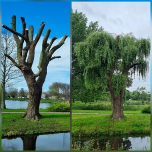 20240725_122352, dezelfde treurwilg in Noteboompark in maart 2024 en in juli 2024