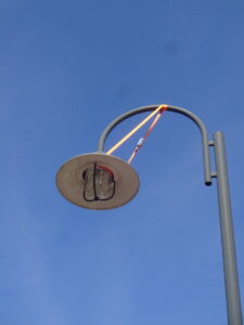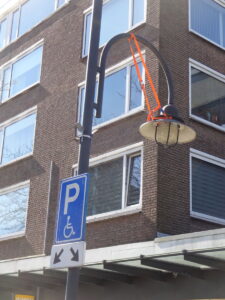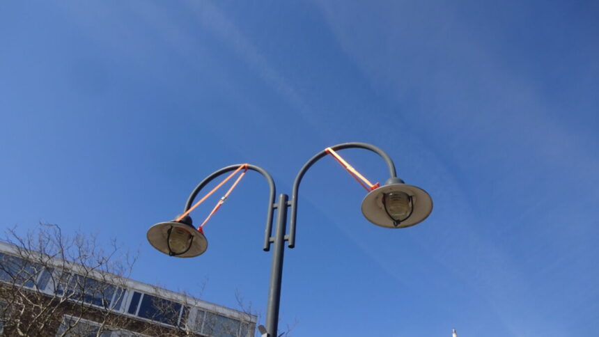 De hanglampen in winkelcentrum Julianabaan Voorburg zijn vrijwel allemaal voorzien van oranje bindbanden. Kennelijk om te voorkomen dat de lampen met kappen naar beneden op het wegdek, en de bezoekers van het winkelcentrum dan wel hun geparkeerde auto’s vallen. Hoe gevaarlijk de toestand is, is onbekend. Bekend is dat de gemeente al jaren bezig is met plannen voor de renovatie van het winkelcentrum. Er ligt nu een zogenoemde ‘voorkeursvariant’. Daarover moet de besluitvorming echter nog plaats vinden. Daarna gaat het nog jaren duren voordat de werken zijn uitgevoerd.