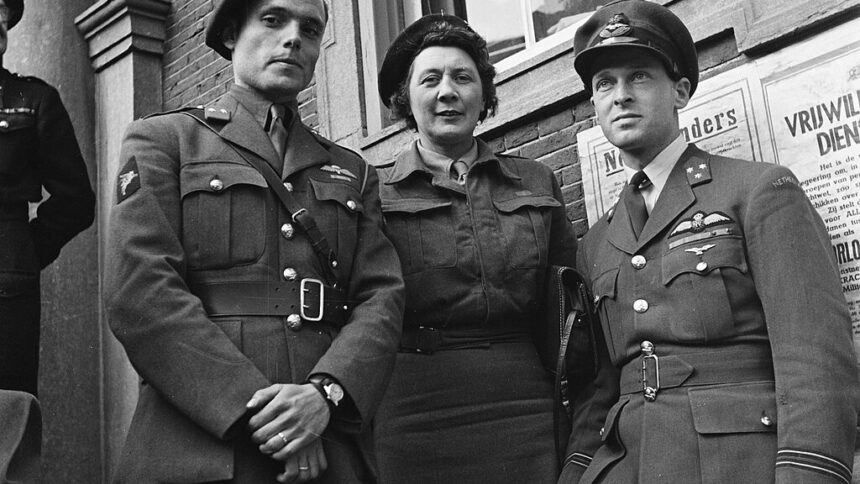 Foto bovenaan, van links naar rechts: Peter Tazelaar, Rie Stokvis en Erik Hazelhoff Roelfzema, de adjudanten van Koningin Wilhelmina, op 2 mei 1945